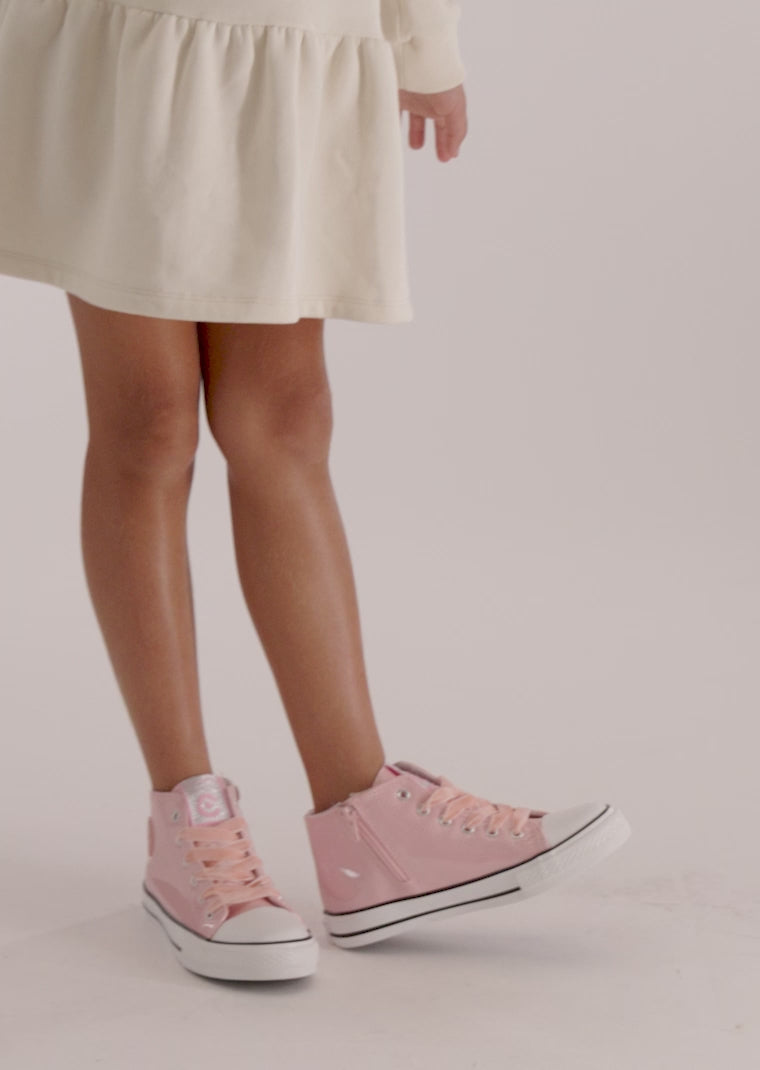 Hohe Turnschuhe aus Lackleder in Pastellrosa mit Conguitos-Details.