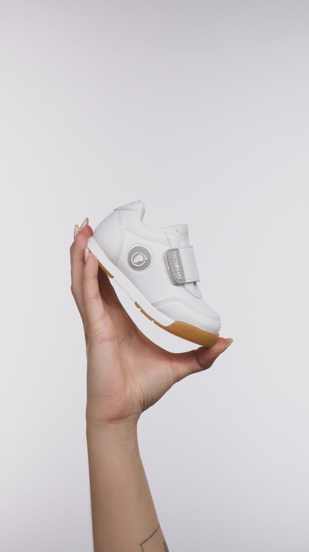 Respektvolle Sneaker-Schuhe in weißer Ausführung für die ersten Schritte. Dieses Design erfüllt alle podologischen Anforderungen: Es ist leicht, flexibel, mit breiter Zehenkappe und einer Zero-Drop-Sohle, die die gleiche Höhe von der Ferse bis zur Zehe beibehält. Diese Eigenschaften erleichtern das freie Gehen und erzeugen so den "Barfuß"-Effekt.