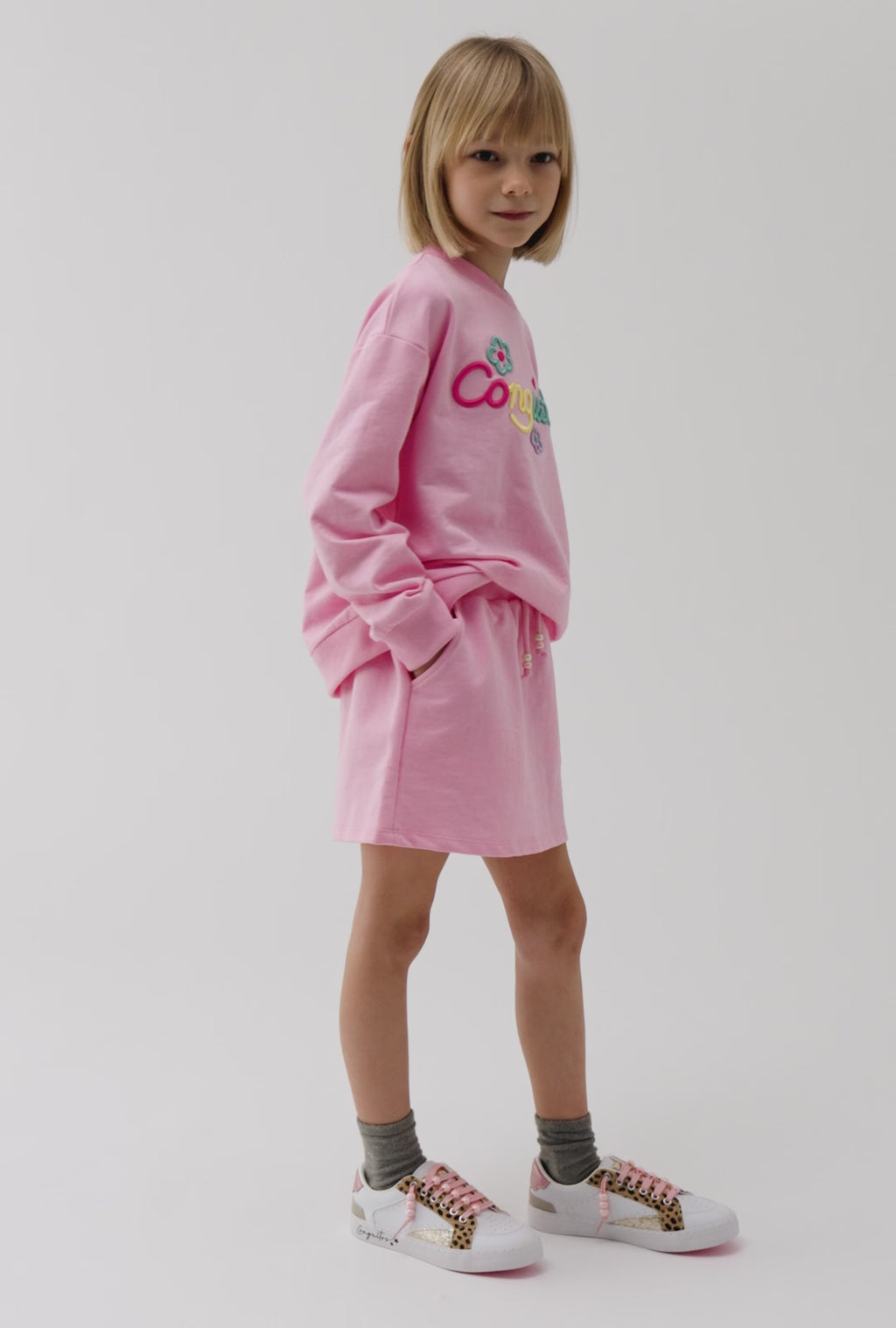 Baskets pour fille de couleur blanche, avec des détails léopard, des touches de glitter et des charms en perles. Elles intègrent également le détail signature Conguitos sur la semelle.
