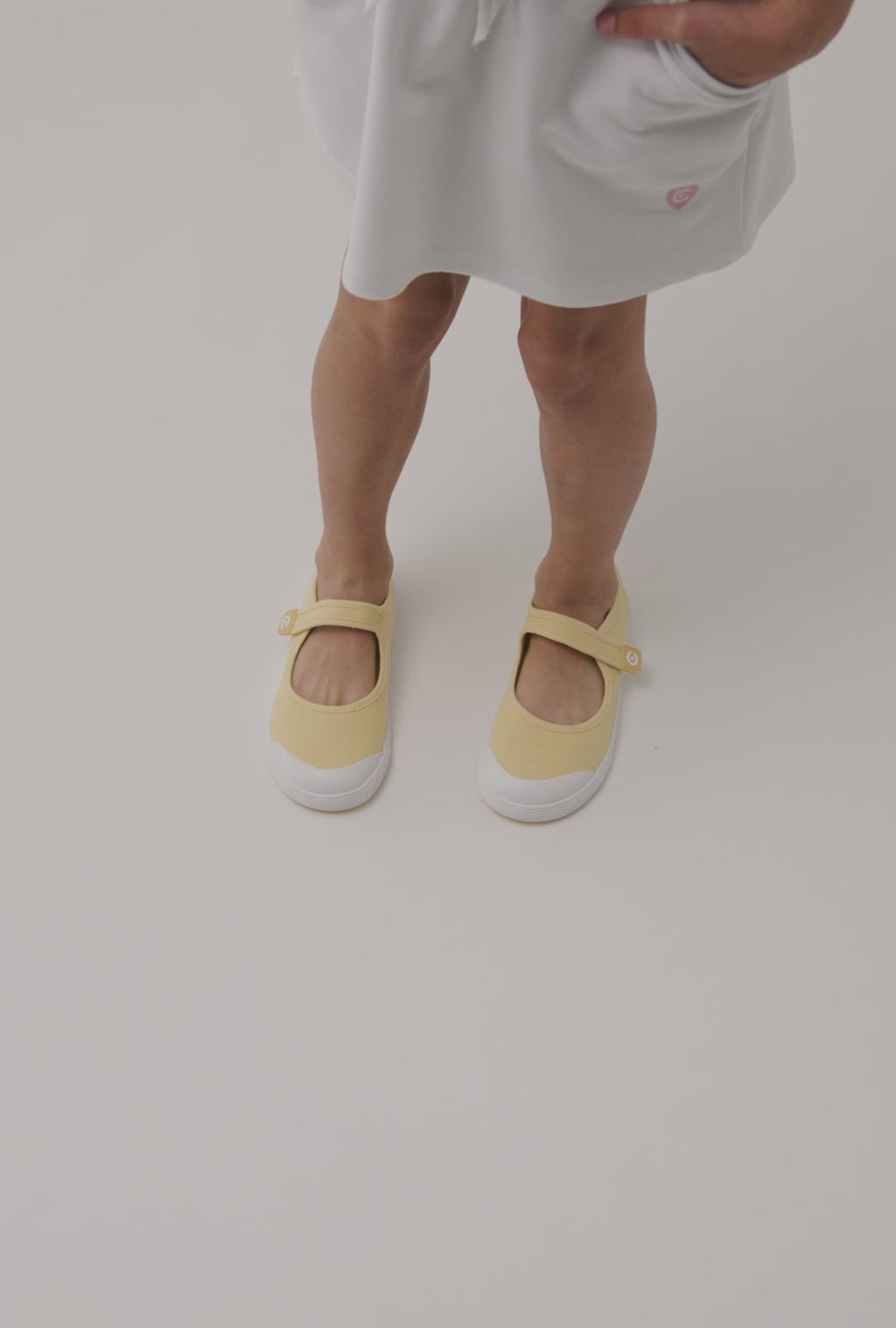 Merceditas Barefoot Goflex in tela in tonalità giallo burro, il colore di tendenza di questa primavera/estate e facile da abbinare. Con stile sportivo e chiusura a strappo per indossarle e toglierle in pochi secondi. Il design semplice, con una suola originale con dettaglio a onde, le rende un’opzione comoda e pratica per la scuola e i weekend
