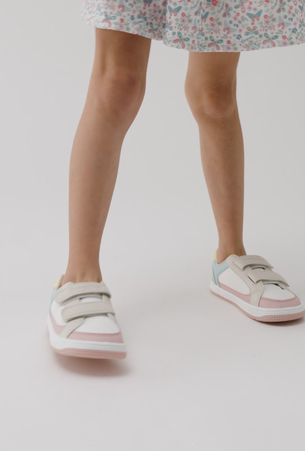 Multicolour barefoot trainers for kids in a fresh mix of pastel colours, easy to match with any look while adding a soft, playful touch, and designed to support natural foot growth with a zero-drop profile and a wide toe box for extra toe freedom. The removable insole helps provide a natural, unstructured feel as they move.