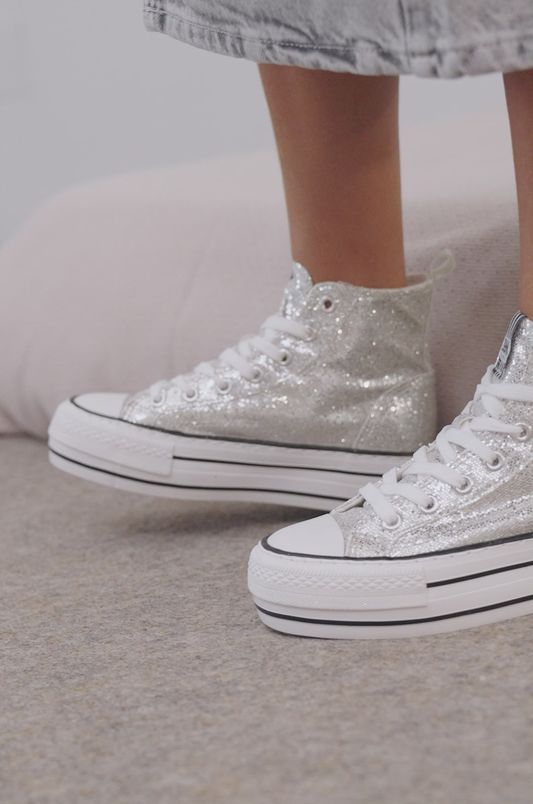 Made with glitter-effect metallic material and textile lining. Its adjustable cotton laces allow for a perfect fit with every step. Additionally, a double-line design on the lower part adds a unique touch.