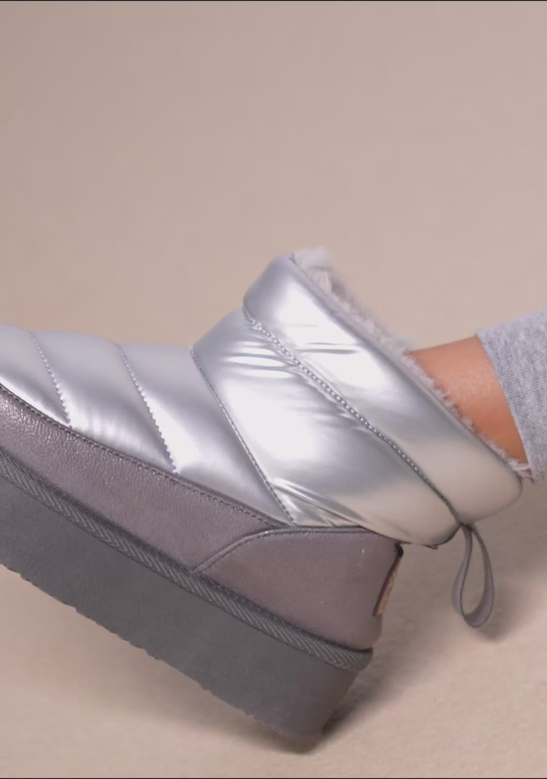 O modelo prateado apresenta uma forro de pele que proporciona o calor necessário para os dias mais frios de inverno. Além disso, os materiais de alta qualidade e a sola dupla isolam os pés do chão frio.