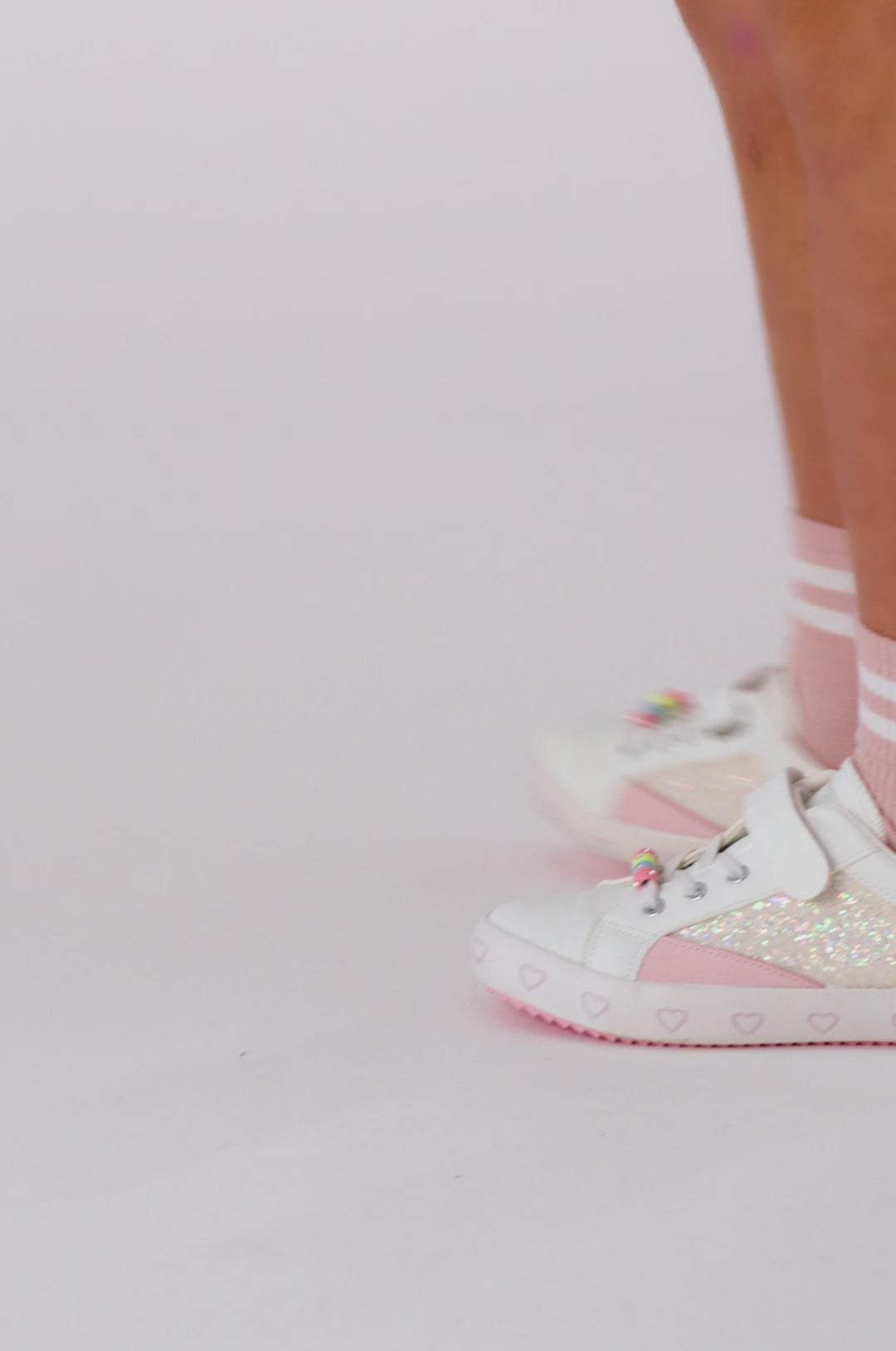 Sapatilhas Brilho Branco/Multicolor da Conguitos, ideais para meninas que querem destacar-se com um calçado confortável e brilhante. O seu design combina detalhes de glitter multicolor com uma sola decorada com corações, dando um toque especial a qualquer look.